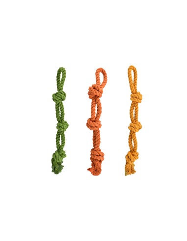 Hundespielzeug aus recyceltem Garn im Inneren und verflochtenem Garn für zusätzliche Strapazierfähigkeit. Dieses weiche Spielzeug fördert die Zahnhygiene und stärkt den Kiefer deines Hundes, ohne die Zähne zu beschädigen. Die Kombination aus Seil und Tennisbällen macht dieses Spielzeug zum Lieblingsspielzeug deines Hundes. Länge 38 cm, erhältlich in drei Farben: Grün, Orange und Lila.