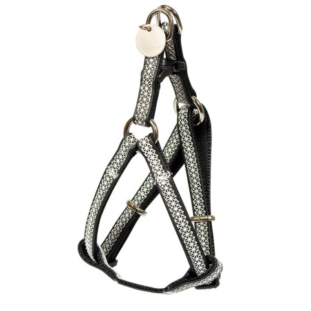 Harnais en similicuir avec imprimé blanc moderne et actuel. Fonctionnel, pratique et élégant. Avec fermeture à clic rapide lors de la mise en place et résistant. Rondelle d'attache réglable et métallique pour une plus grande durabilité et résistance. Disponible en deux couleurs et trois tailles.