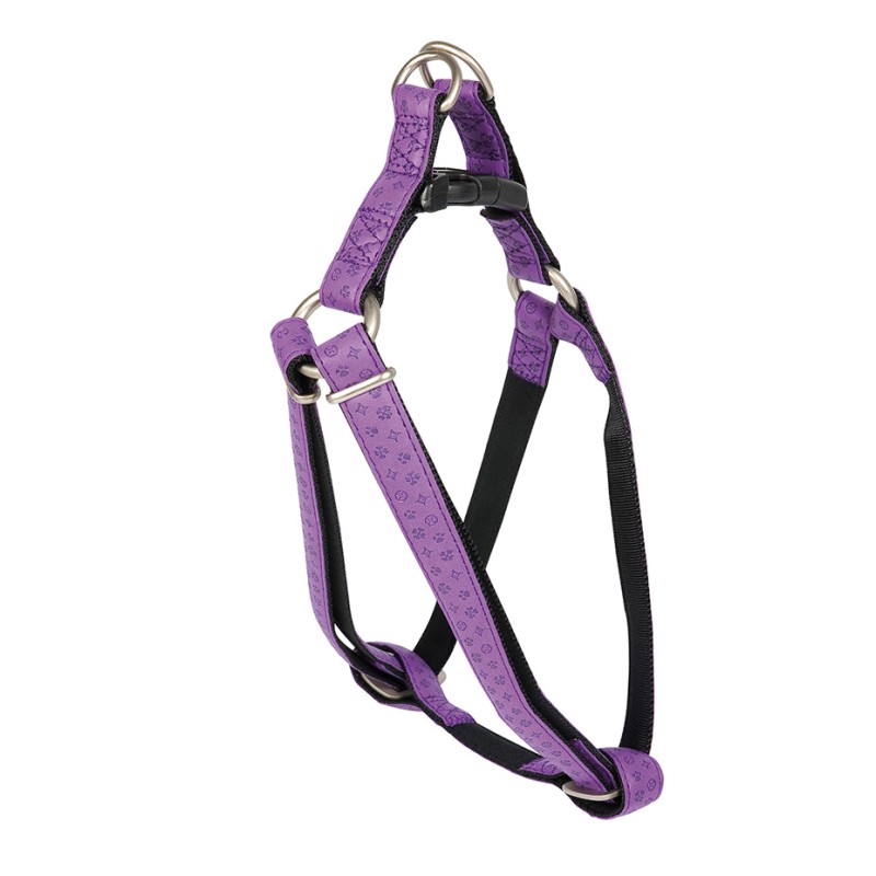 Pettorina in similpelle con stampa in rilievo. Funzionale, pratica ed elegante. Imbottita per offrire il massimo comfort, con chiusura a scatto per farla indossare rapidamente e resistente. Regolabile e con anello di fissaggio in metallo per una maggiore durata e resistenza. Disponibile in sei colori e quattro misure.