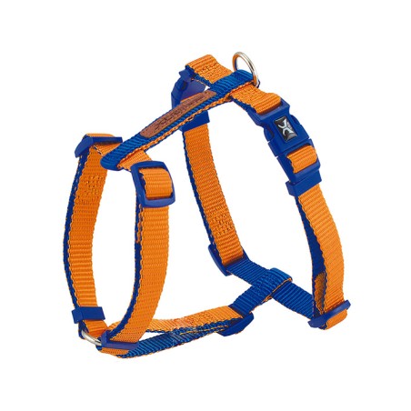 Arnês de nylon com cinco pontos de regulação para uma ótima adaptação. Fabricado em nylon duplo que combina duas cores. Dois fechos click e arruela metálica para maior segurança e resistência. Disponível em 8 combinações de cores e 4 tamanhos.