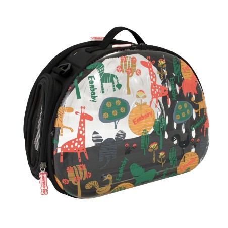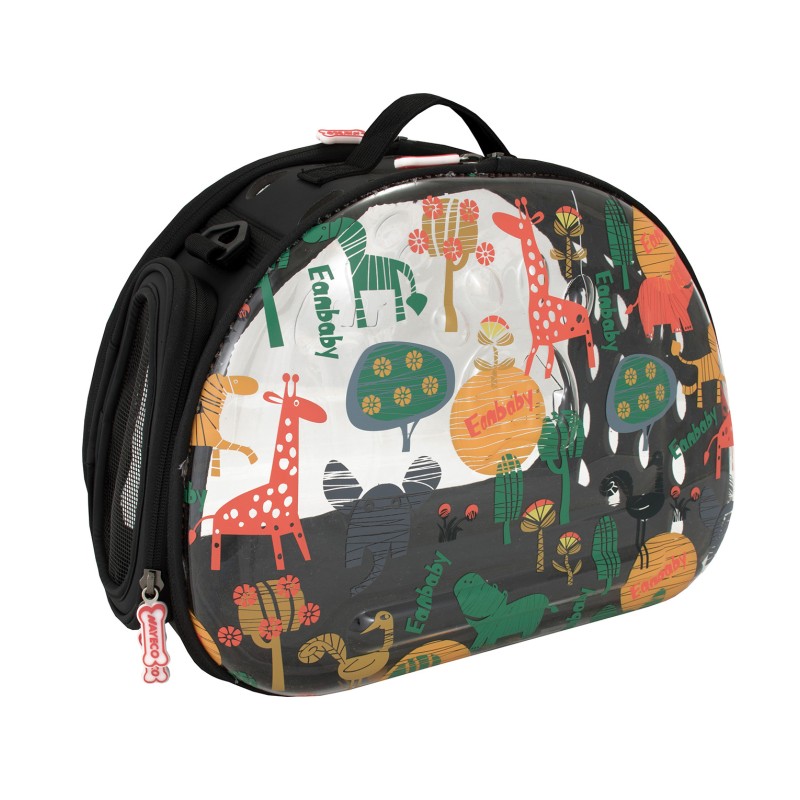 Bolsa transparente decorada com um design divertido e casual. É uma bolsa ideal para transportar a nossa mascote connosco de forma segura e prática. Tem uma alça pequena e também longa para que você possa pendurá-la no ombro. Piso e paredes rígidas para dar mais conforto e segurança ao nosso animal de estimação. Possui grades de ventilação para que nosso animal de estimação não se sinta sobrecarregado e tenha uma visão completa do entorno. Disponível em dois tamanhos e duas estampas diferentes: pegadas rosa e selva.