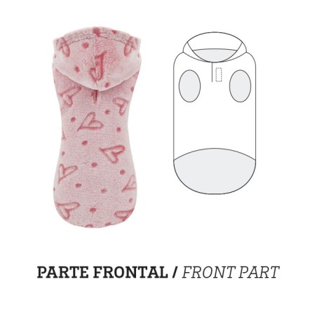 Moletom rosa decorado com corações divertidos e bolinhas. Fabricado com materiais de alta qualidade, muito macios e confortáveis para a nossa mascote. Totalmente adaptável, com ilhó para a alça e elástico para a cauda